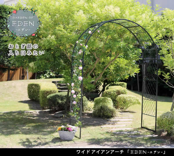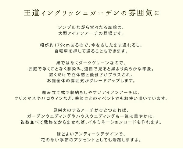 ワイドアイアンアーチ【送料無料 ダークグリーン アイアン アーチ 門 木製 バラ 薔薇 フェンス おしゃれ 小型 北欧 ガーデニング 屋外 家具 ツタ 蔦 エントランス エクステリア ロマンチック トレリス 園芸支柱 つるバラ 誘引 黒 ブラック 】 SM-IA-ED001GRNの詳細情報 商品の仕様・スペック 販売ページを 参照下さい。